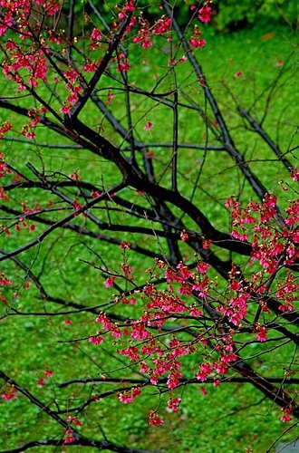 每年的 1 ~ 2 月是櫻花開花的季節,萬紫千紅與婀娜多姿的風采是多麼的迷人.在北部許多地方都可以觀賞到美麗的櫻花盛開,幸運的我不用出遠門,推開門窗就可以看到樓下花園已綻放了粉紅的櫻花,站在人行道望著這屬於寒冬裡的花朵,雖然細雨綿綿,但仍不失它那優雅迷人的花蕊開滿了枝頭,尤其在碧草如茵的柔和背景襯托之下,讓整體視覺感充滿詩情畫意的情境,實在令人著迷,美麗極了.