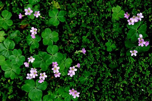 代表幸運的酢醬草花也從杜鵑花叢冒出來.
