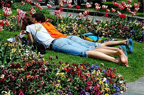 這對年輕的情侶, 躺在美麗的花海裏