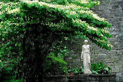 美麗的女神雕像, 矗立在白色花開的角落.