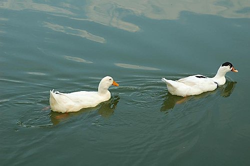 夫唱婦隨的鴨子正悠閒地游在湖水上